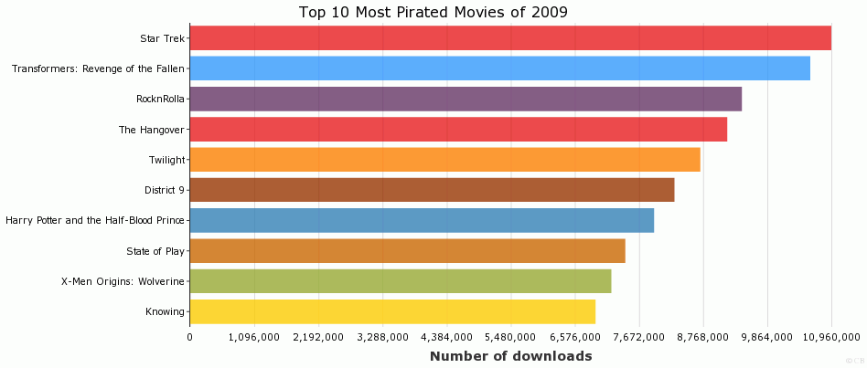 The above graph is from ChartsBin, showing the top 10 most pirated movies of 2009. The list, which was collected by Torrent Freak from several sources, is pretty odd. It's not surprising that big Hollywood blockbusters like Star Trek and Transformers: Revenge of the Fallen topped the list, but who would have thought that a film like Guy Ritchie's Rocknrolla would end up at #3?